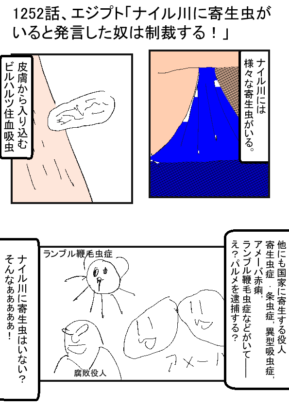 ★(ノ゜ω゜)(ノ゜ω゜)先生ぇー!今日からアンタは犯罪者だぁー! ナイル川に寄生虫が大量発生しているって情報を、かなり前に記事にしたよね!? ーー †(m´・ω・`)そんな!? ーー ★(ノ゜ω゜)(ノ゜ω゜)はい!先生は刑務所送り! ーー †(m´・ω・`)ふぇぇぇぇ!ダムができたせいで、大量の寄生虫が発生したのにぃぃぃ! こうなったら、裁判官と偉い人に、ナイル川の水を飲んでもらうしか―― ーー ★(ノ゜ω゜)(ノ゜ω゜)やめろぉー!?寄生虫が体内に入ってくるだろぉー!? 皮膚から入り込む奴とかも、現実にはいるんだぞ!? ーー |