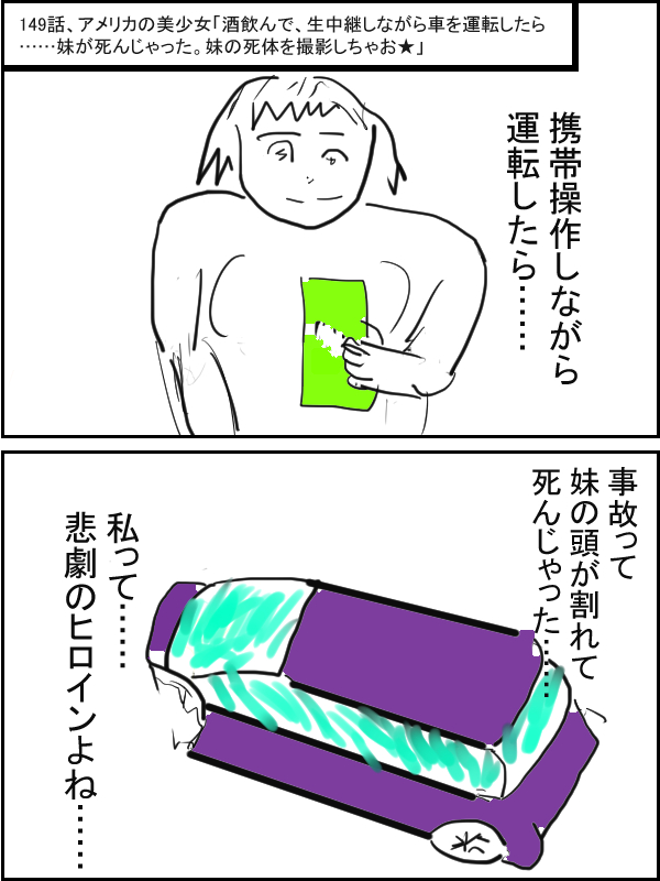 | アメリカの美少女「酒飲んで、生中継しながら車を運転したら……妹が死んじゃった。妹の死体を撮影しちゃお★」 |
