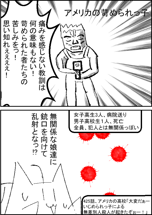 案外、銃社会っていじめに対する抑止力になってんじゃね。 いじめによる無差別殺人は聞いても、いじめによる自殺は聞かない。