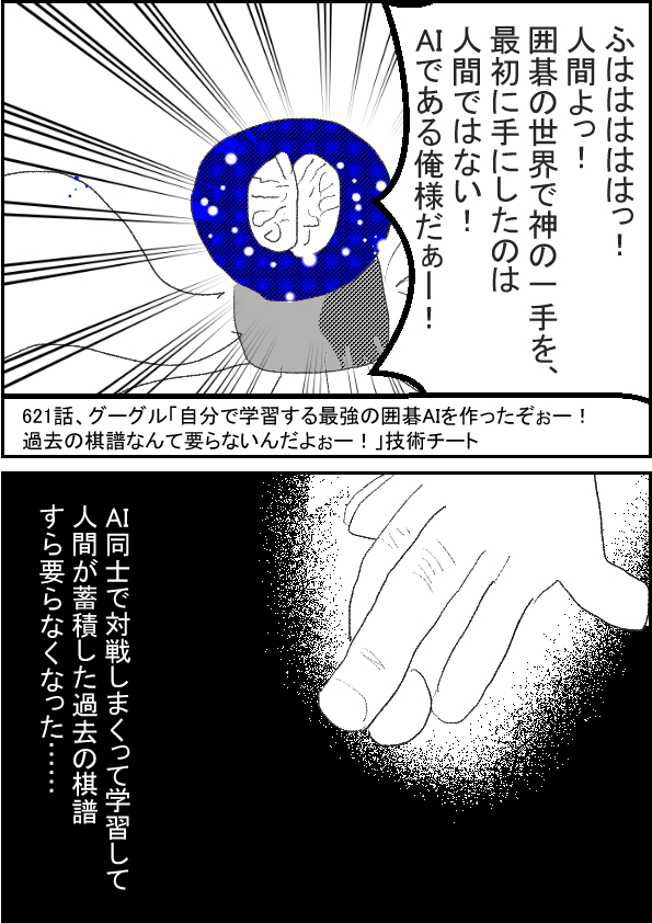 ーーー グーグル(ノ✖ω✖)ふははははは!人間を完全に超越したAIを開発したぞぉー! もう、棋譜などいらぬっー!