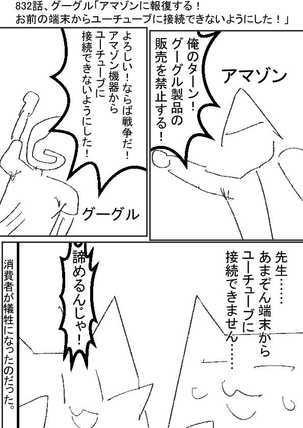 ★(ノ゜ω゜)(ノ゜ω゜)つまり、どういう事だ!? †(´・ω・`)アマゾンが謝罪しないと……長期戦になりそうじゃな……先に仕掛けた訳じゃし…… ★(ノ゜ω゜)(ノ゜ω゜)というか……グーグル的にも、これ大損じゃ……? YOUTUBEが誰でも見れるという気楽さがなくなるし…… †(´・ω・`)でぇじょうぶだ。きっと将来的には和解するじゃろうて…… ★(ノ゜ω゜)(ノ゜ω゜)アンタ、解決する気が欠片もないな!? †(´・ω・`)アマゾン機器使ってないから関係ないもん ★(ノ゜ω゜)(ノ゜ω゜)こらぁー!?