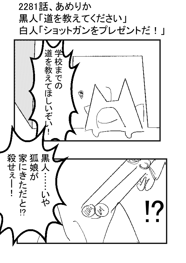 ーー ★(ノ゜ω゜)(ノ゜ω゜)先生ぇー!どういう事だぁー! ーー †(´・ω・`)道を尋ねてきたのが……狐娘だったら、モフモフしてもええかのう? ーー ★(ノ゜ω゜)(ノ゜ω゜)いや、モフハラだからな?!それ! ーー †(´・ω・`)じゃ、少年側も武装すればワンチャンス(ライフル協会風 ーー ★(ノ゜ω゜)(ノ゜ω゜)こらぁー!?人死がでるでろー!? ーー †(´・ω・`)道尋ねるだけで、発泡されるんじゃし。 武装しないとダメじゃろ? ーー ★(ノ゜ω゜)(ノ゜ω゜)どんな理屈だ!?先生なんてオークの巣に道を聴きに行って、鍋の具になればいいんだ! ーー †(´・ω・`)!?