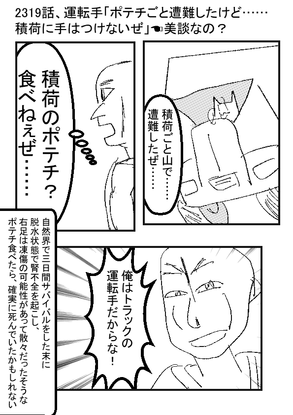 運転手(ノ✖ω✖)俺はポテチは食べねぇ! 自然で三日間サバイバルして野宿して、歩きまくって、病院にいくぜ! ---