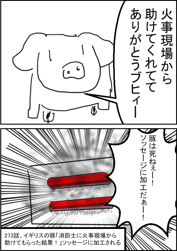 イギリスの豚「消防士に火事現場から助けてもらった結果!」ソッセージに加工される | 2017 8/26 |