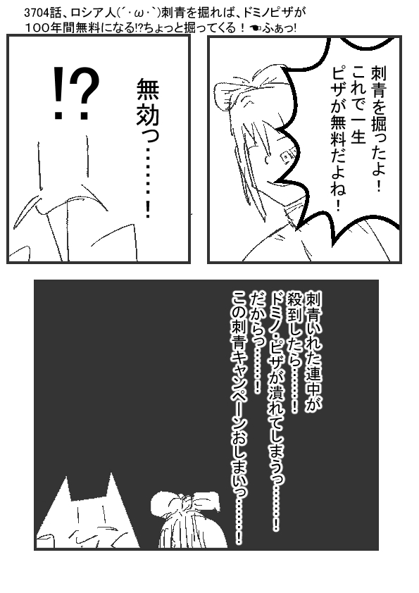 ★(ノ゜ω゜)(ノ゜ω゜)先生ぇー!この企画を考えた奴は何を考えているんだぁー!? 無料でずーと、ピザを提供し続ける赤字企画だぞ!これ! ーー †(´・ω・`)クソ高いピザを無料で食べ放題…… 最強じゃのう…… ー ★(ノ゜ω゜)(ノ゜ω゜)太るぞ! ーー †(´・ω・`)でぇじょうぶだ!ロシア人は寿命が短い! ー ★(ノ゜ω゜)(ノ゜ω゜)それのどこが大丈夫なんだ!? ーー †(´・ω・`)ドミノ・ピザが倒産したら、刺青の彫り損じゃな…… ー ★(ノ゜ω゜)(ノ゜ω゜)ふ、不吉な予想はやめろぉー! |