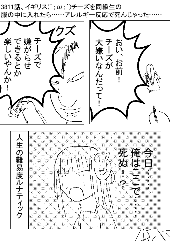 >チーマ君は小麦、グルテン、乳製品、卵、ナッツに対する重度のアレルギーがあり、喘息とアトピー性湿疹にかかっていた ー ★(ノ゜ω゜)(ノ゜ω゜)あの……パンも牛乳も食えない……? ーー †(´・ω・`)うむ、大抵のお菓子類はアウトじゃな ー ★(ノ゜ω゜)(ノ゜ω゜)人生の難易度がルナティック……? ーー †(´・ω・`)この事件なくても、近いうちに死んでそうじゃな…… ー ★(ノ゜ω゜)(ノ゜ω゜)いや、服の中にチーズいれたせいじゃ? 潰れて触れる面積が広がれば、それだけアレルギー反応がでると思います ーー †(´・ω・`)(やっぱり、いじめっ子が100%悪かった……?) |