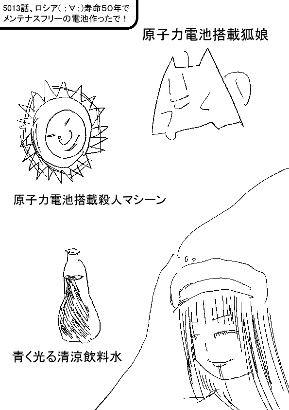 ー ★(ノ゜ω゜)(ノ゜ω゜)先生ぇー!すごい発明……なんですか? ーー †(´・ω・`)宇宙探査機とかに、搭載してそうじゃな……たぶん……(地球から遠くへ飛ばすから、原子力でいいし ー ★(ノ゜ω゜)(ノ゜ω゜)危ないの? ーー †(´・ω・`)……フォールアウトの世界を思い出した ー ★(ノ゜ω゜)(ノ゜ω゜)こら!?そこら中、核動力の狂った世界観を想像するな!? ーー †(´・ω・`)車の燃料?核燃料さ! ー ★(ノ゜ω゜)(ノ゜ω゜)ぬか・こーらでも飲んでろ! ーー †(´・ω・`)隠し味が放射能なアレ!? |
