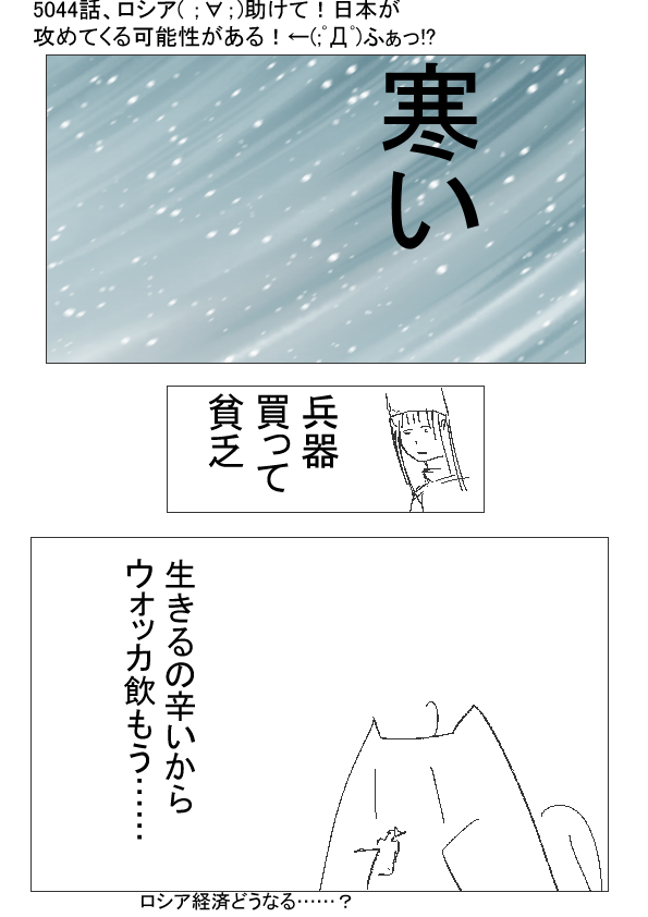ー ★(ノ゜ω゜)(ノ゜ω゜)先生ぇー!どういう事だぁー!? ーー †(´・ω・`)ほら、ロシア経済ってウンコじゃろ? ー ★(ノ゜ω゜)(ノ゜ω゜)ウンコ扱いするな!? ーー †(´・ω・`)寒くて貧乏で、生活苦しいじゃろ? そんでソ連崩壊の時に苦しみすぎて、精神病になった人らも量産されて大変じゃろ? ー ★(ノ゜ω゜)(ノ゜ω゜)ロシアのいいところを見るんだ! ーー †(´・ω・`)経済がやばいから、喧嘩をうってもいい外敵がほしいとか、そんなところかのう……(EUやアメリカに喧嘩売るより、デメリットないし…… |