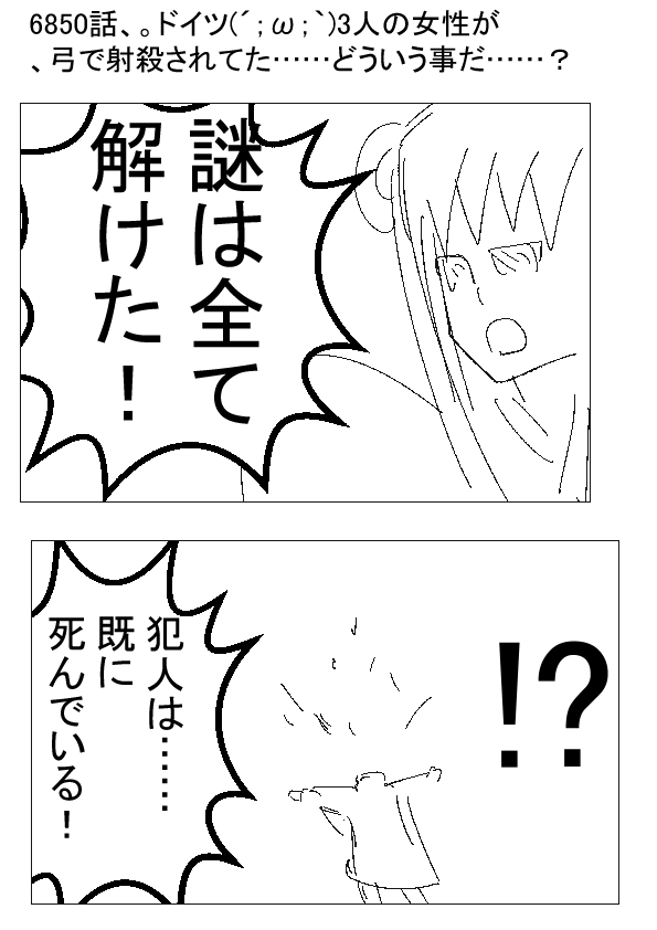 ー ★(ノ゜ω゜)(ノ゜ω゜)先生ぇー!これ、別に謎な事件でもなんでもないぞー!? 自殺と考えれば、全てに説明がつくだろー! ーー †(´・ω・`)……もしも他殺だったら? ー ★(ノ゜ω゜)(ノ゜ω゜)な、なんだってー!? 3人の女性が矢で貫かれて死んでいるんだよ!? ーー †(´・ω・`)トリックだ! ー ★(ノ゜ω゜)(ノ゜ω゜)先生はコナンの見すぎだ! ベイカーシティにいけ! ーー †(´・ω・`)犯罪都市は嫌じゃ! |