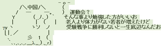 - o - /\中国/\ ( / ― ―。 ) 運動会? Y ( _ノ、_) ` そんな事より勉強した方がいいお | | ( | 老人より体力がない若者が増えたけど γy ヽ ゝソ ノ 受験戦争に勝利しないと一生底辺なんだお | | / | `、´ 彡 1 ( `、、,、,、,、,,,,λ.,,_).,_r) ![]() |