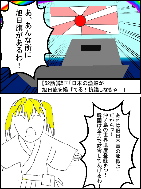 | 【漫画】●韓国「日本の漁船が旭日旗を掲げてる!抗議しなきゃ!」 |