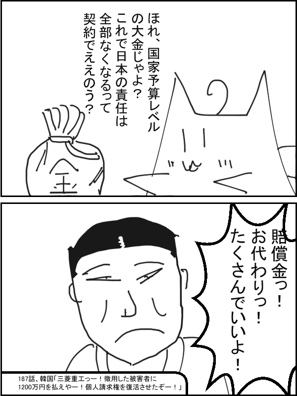 ★(ノ゜ω゜)(ノ゜ω゜)先生ぇー!消滅したはずの請求権が復活しましたー! †(´・ω・`)……それ以前に、これ時効じゃろ…… 70年前の賃金未払いとか……誰が払うんじゃ…… ★(ノ゜ω゜)(ノ゜ω゜)日本じゃ? †(´・ω・`)いや……韓国政府が払うべき代物じゃろ…… 日本は既に、大金を韓国に渡したから、請求先は韓国政府になるべきじゃろ…… ★(ノ゜ω゜)(ノ゜ω゜)そんな展開になったら、韓国政府が破滅するでしょ!? ただでさえ、厳しい状況なのに! †(´・ω・`)よし、じゃ、日本も朝鮮半島に置いてきた資産を請求しよう! ★(ノ゜ω゜)(ノ゜ω゜)悪乗りするな!こら! 【東アジアのニュースと歴史】☚まとめたページ 日付順に記事を表示する?(´;ω;`) | ||