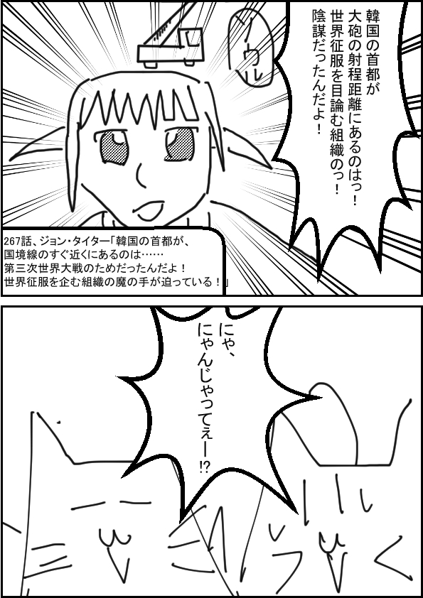 | 東アジアの歴史・現代ニュース【508] ジョン・タイター「韓国の首都が、国境線のすぐ近くにあるのは……第三次世界大戦のためだったんだよ!世界征服を企む組織の魔の手が迫っている!」 |