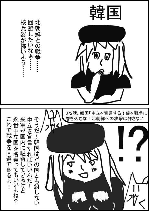 | 韓国「中立を宣言する!俺を戦争に巻き込むな!北朝鮮への攻撃は許さない!」 | ||