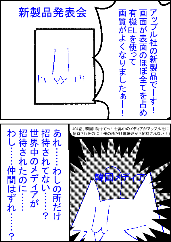 | 韓国「助けてっ!世界中のメディアがアップル社に招待されたのに!俺の所だけ違法だから招待されない!」 | ||