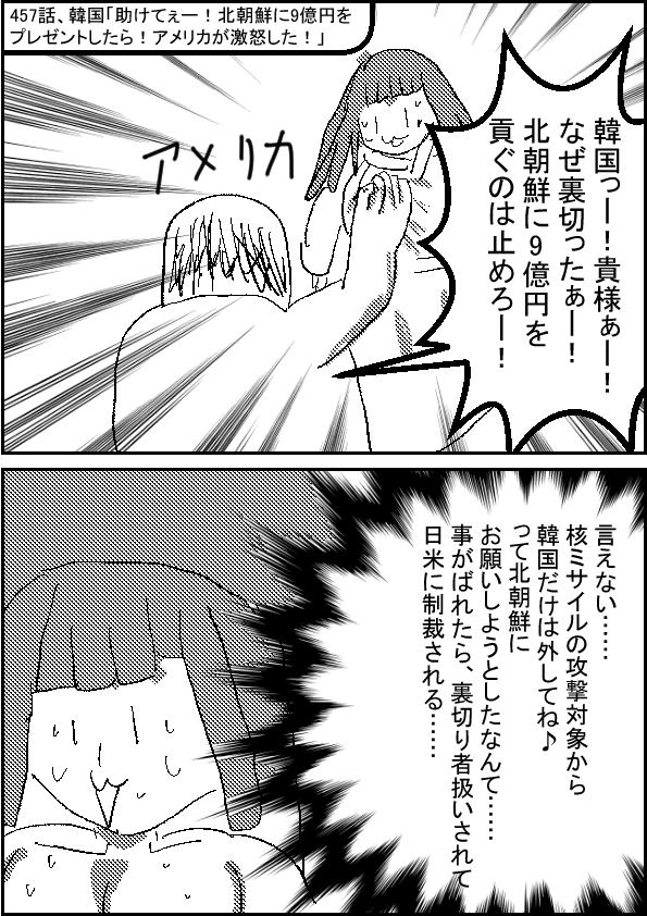 韓国「助けてぇー!北朝鮮に9億円をプレゼントしたら!アメリカが激怒した!」 | ||