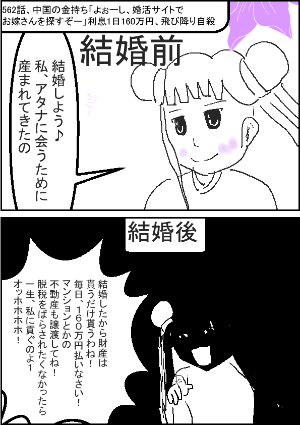 | 中国の金持ち「よぉーし、婚活サイトでお嫁さんを探すぞー」利息1日160万円、飛び降り自殺 | ||