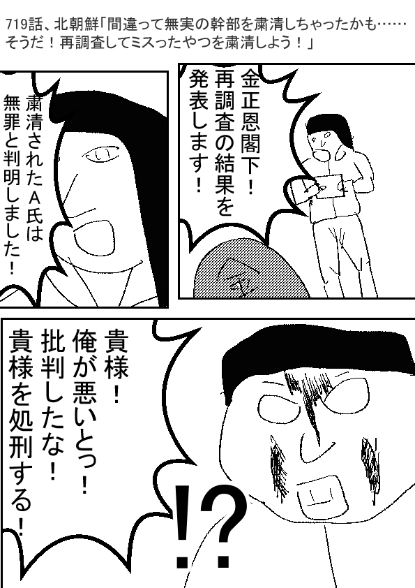 | 東アジアの歴史・現代ニュース【591] 北朝鮮「間違って無実の幹部を粛清しちゃったかも……そうだ!再調査してミスったやつを粛清しよう!」 |