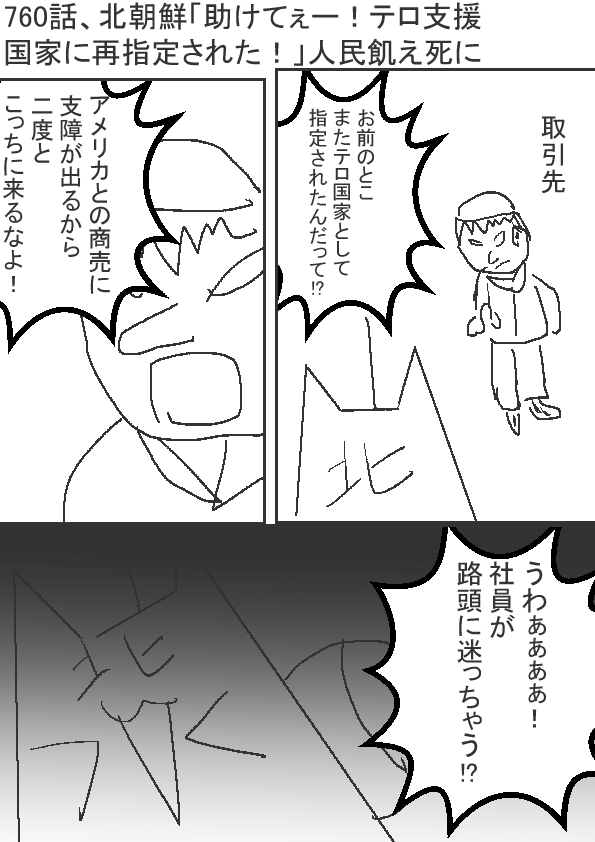 ★(ノ゜ω゜)(ノ゜ω゜)先生!つまり、どういう事だ!? †(´・ω・`)北朝鮮はテロ国家じゃしのう…… ★(ノ゜ω゜)(ノ゜ω゜)失礼だな!? †(´・ω・`)兄の金正男を暗殺して、ベトナムやマレーシアとかで大問題になっているし…… ★(ノ゜ω゜)(ノ゜ω゜)本当にテロ国家だった!? †(´・ω・`)恐らく、どんどんテロリスト扱いされて、資産凍結されまくって、路頭に迷う連中が増えると思うぞい…… ★(ノ゜ω゜)(ノ゜ω゜)先生の予想が酷い!? †(´・ω・`)大量に人民が餓死するじゃろうなぁ…… | ||