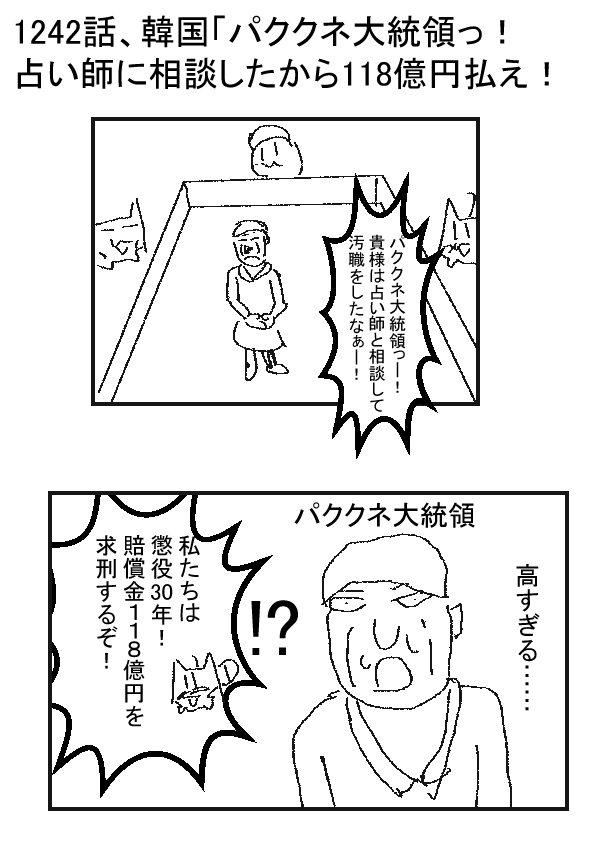 ーー ★(ノ゜ω゜)(ノ゜ω゜)先生ぇー!賠償金の額が高すぎるぞー! ーー †(´・ω・`)でぇじょうぶだ! 犯罪者の97%は、まともに賠償払わずに時効だから! ーー ★(ノ゜ω゜)(ノ゜ω゜)こら!?日本の話をするな!? 懲役30年の方はどうなるんだ!? ーー †(´・ω・`)求刑の話だから、もっと減額されるし、ワンチャンス それに、他の大統領も逮捕されたり、息子が逮捕されたり、自殺しているし……いつもの事じゃろ…… ーー ★(ノ゜ω゜)(ノ゜ω゜)韓国では大統領になることが罰ゲームなのかぁー!? |