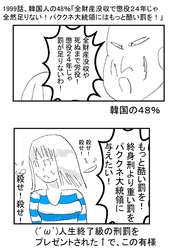 東アジアの歴史・現代ニュース【738] 韓国人の48%「全財産没収で懲役24年じゃ全然足りない!パククネ大統領にはもっと酷い罰を!」 |