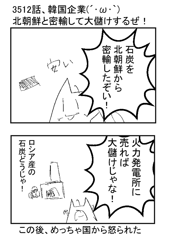 ーー ★(ノ゜ω゜)(ノ゜ω゜)先生ぇー!北朝鮮が貿易して稼いでいるぞー! ーー †(´・ω・`)石炭ってことは……火力発電所とかで使えるのう…… 韓国の市場で消費できてウハウハじゃな? ーー ★(ノ゜ω゜)(ノ゜ω゜)ミサイル費用になるぞ!? ーー †(´・ω・`)こういう経済制裁の時に、密輸する国が続出しまくるのがテンプレじゃし…… ーー ★(ノ゜ω゜)(ノ゜ω゜)いやなテンプレだな!? ーー †(´・ω・`)(儲け話だもの……) |