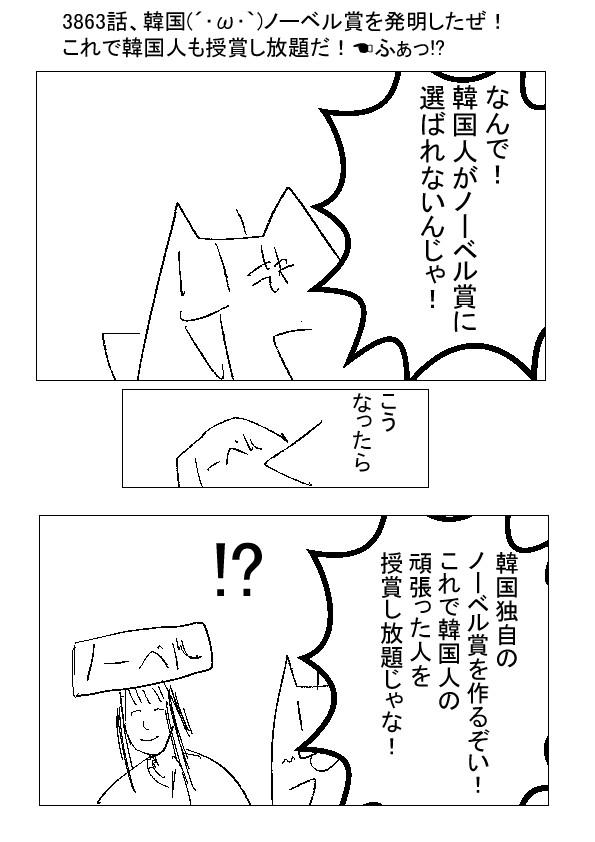 ー ★(ノ゜ω゜)(ノ゜ω゜)先生ぇー!よかったですねー! 韓国の皆が大喜びですよー! ーー †(´・ω・`)うむ……どうやら、韓国人はノーベル賞の意味とかしらんじゃろうし…… これでいいんじゃないかな…… ー ★(ノ゜ω゜)(ノ゜ω゜)話が終わった……? ーー ノーベル(´;ω;`)平和とか発展のために頑張った人とかに賞をあげるのに……勝手に使われて、つらたん |