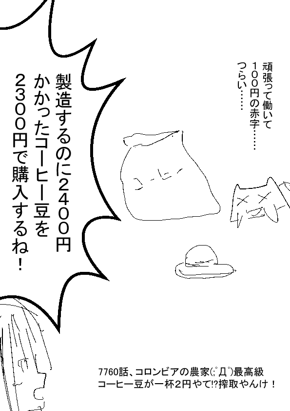 ★(ノ゜ω゜)(ノ゜ω゜)先生ぇー!大変だぁー!コーヒー農家が搾取されてるぞー! -- †(´・ω・`)……コーヒーを大量生産しまくったら、そりゃ買い叩かれるじゃろ…… -- ★(ノ゜ω゜)(ノ゜ω゜)こら!? -- †(´・ω・`)絵師だって、絵を描くのに時間かかるけど、絵師多いから、買い叩かれてるじゃろ? 供給が多いと安くなるんじゃよ -- ★(ノ゜ω゜)(ノ゜ω゜)そんな!?どうすればいいんだ!? -- †(´・ω・`)(なにか特別な価値をつけないと……廃業じゃろうなぁ……)
