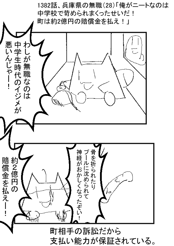 ー ★(ノ゜ω゜)(ノ゜ω゜)先生ぇー!これ、どうなると思う? -ー †(m´・ω・`)……賠償金を貰えなくても、いじめっ子達に社会的大ダメージを与えて報復できるからワンチャンス? ー ★(ノ゜ω゜)(ノ゜ω゜)それだと、いじめられた側に旨みがないだろうが!? -ー †(m´・ω・`)わしの推理的には……恐らく敗訴じゃな。 だって、物証ないだろうし。 時間が経過しすぎて、証言も集まらないじゃろう? 中学生の頃のイジメなんて覚えてませんーって人が多いじゃろうし。 ー ★(ノ゜ω゜)(ノ゜ω゜)やめろ?!それだと、苛められ損だろ!? -ー †(m´・ω・`)(そもそも……骨を折るレベルの暴行は……イジメじゃないと思う……傷害罪じゃろ…) |