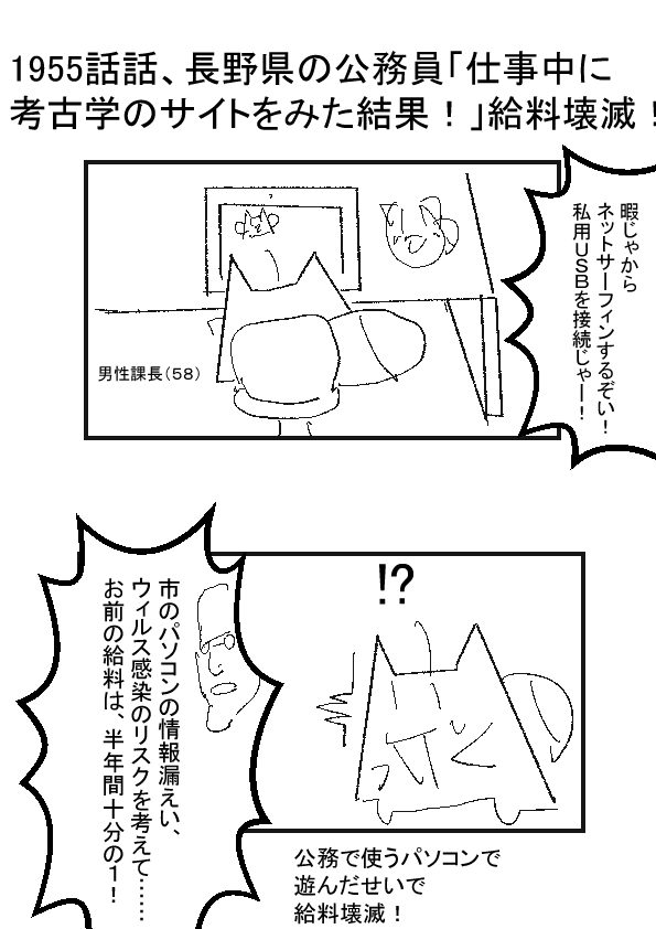 ーー ★(ノ゜ω゜)(ノ゜ω゜)先生ぇー!給料が10分の1になって壊滅状態だぁー! -ー †(m´・ω・`)罰則が厳しいのう…… きっと周りから嫌われていたんじゃな…… ーー ★(ノ゜ω゜)(ノ゜ω゜)そんな推理はやめろー!? -ー †(m´・ω・`)(給料どれくらい減ったんじゃろうなぁ……) |