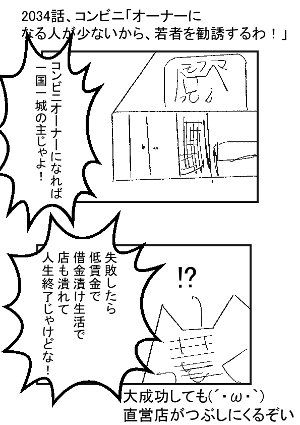 ー ★(ノ゜ω゜)(ノ゜ω゜)先生ぇー!コンビニオーナーになりませんかぁー! -ー †(m´・ω・`)学生をオーナーにするという事は……借金漬け奴隷生活の始まり? ー ★(ノ゜ω゜)(ノ゜ω゜)そんな推理はやめろ?! -ー †(m´・ω・`)じゃ、親から金を引き出す? ー ★(ノ゜ω゜)(ノ゜ω゜)金だして、わざわざ奴隷になるようなセリフはやめろ! -ー †(m´・ω・`)(連帯保証人にさせて、一家から金を吸い上げるつもりなのかのう……) |