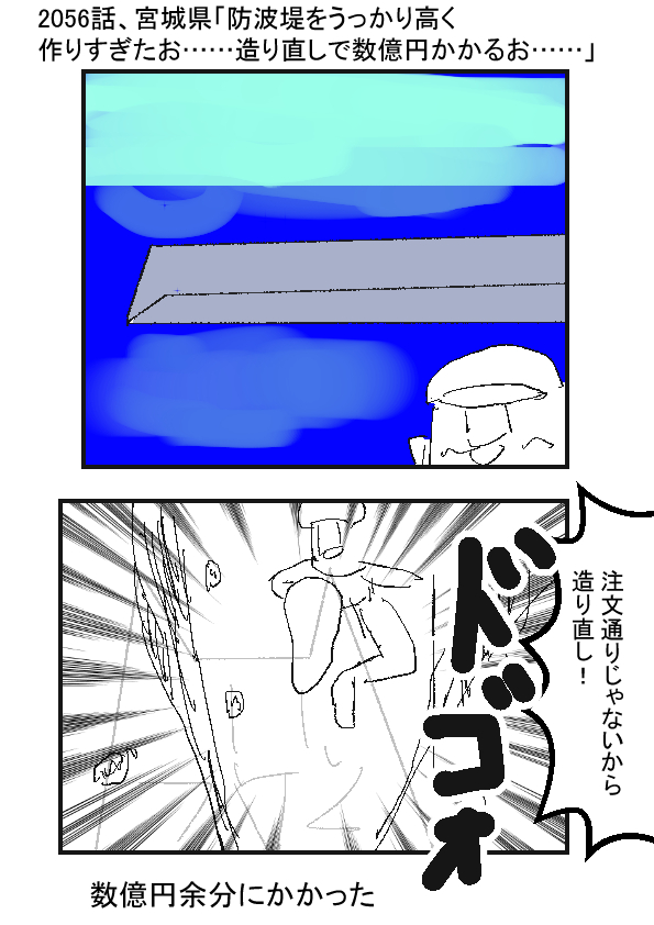 ー ★(ノ゜ω゜)(ノ゜ω゜)先生ぇー!造り直しですー! -ー †(m´・ω・`)数億円の予算を、税金からだせ……? ー ★(ノ゜ω゜)(ノ゜ω゜)はい -ー †(m´・ω・`)防波堤高くなってもええじゃろ…… ー ★(ノ゜ω゜)(ノ゜ω゜)いや……作り直すという事は、なんかのデメリットがあるんじゃ……? 壁を高くしたら、どうなると思います? -ー †(m´・ω・`)……壊れやすくなる?(攻城戦思考 ー ★(ノ゜ω゜)(ノ゜ω゜)ひどい推理だな?! -ー †(m´・ω・`)でも、22cmなんて誤差のようなものだし、このままでええんじゃね? ー ★(ノ゜ω゜)(ノ゜ω゜)適当だ!? -ー |