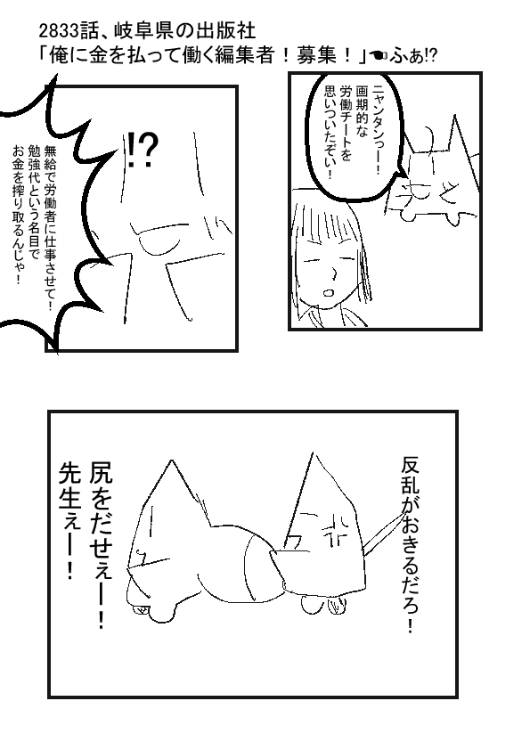 ◎応募条件 ・編集経験のある方 ・岐阜・美濃市または近隣地域に在住してくださる方(通勤時間30分以内) ・動物、畑仕事が好きな方 ・試用期間中(1〜3ヶ月)、「ここで学んだ」ということに対して対価を払っていただける方 (対価については、みなさまが「学んだ」と思うに見合う額を自由にお支払いください) ◎編集部から提供できるもの ・住居(試用期間中は無料でお貸しだしいたします) ・自転車の貸し出し ・試用期間(1〜3ヶ月)が終了し本契約をしたのちは、お給料をお支払いします ー ★(ノ゜ω゜)(ノ゜ω゜)先生ぇー!なんだぁー!これはぁー! ーー †(m´・ω・`)出版業界が大不況だから……金を払ってくれる労働者を集めておるんじゃな? ー ★(ノ゜ω゜)(ノ゜ω゜)それ、仕事じゃないよ!?働いて給料なしで、会社に金を恵む時点で! ーー †(m´・ω・`)(異世界で、狐娘をモフモフしたいのう…… 現実はクソゲーじゃな……) |