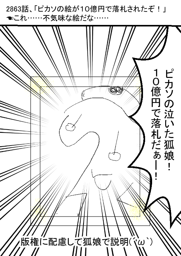 ー ★(ノ゜ω゜)(ノ゜ω゜)先生ぇー!なぜ10億円で売れるんだぁー! 1930年代の作品なら、そんなに希少性はないだろー! ーー †(m´・ω・`)そんだけ評価されているって事じゃな……ちなみに……わしの絵は何円で売れる? ー ★(ノ゜ω゜)(ノ゜ω゜)1円? ーー †(m´・ω・`) ー ★(ノ゜ω゜)(ノ゜ω゜)あれ?先生? ーー †(m´・ω・`) ー ★(ノ゜ω゜)(ノ゜ω゜)し、死んでる…… ーー †(m´・ω・`)(眠いから寝よう) |