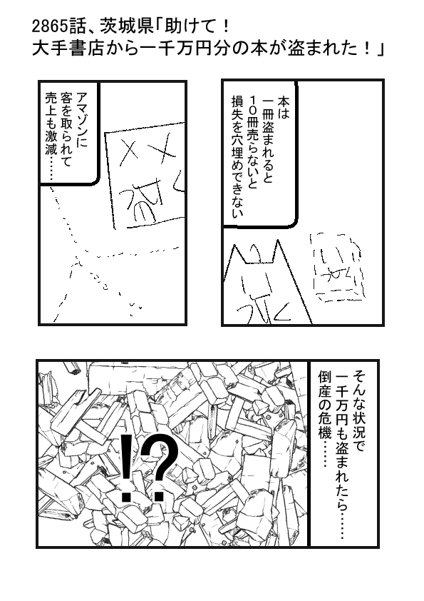 >書籍の万引では、今年3月、土浦市上高津の書店でコミック本40冊(販売価格1万7000円)を盗んだ50代の男が、常習累犯窃盗の疑いで、県警に逮捕された。男は前にも同じ書店でコミック本31冊(同1万4000円)を盗んでいた。 ー ★(ノ゜ω゜)(ノ゜ω゜)先生ぇー!本が盗まれすぎだぞー! ーー †(m´・ω・`)……うむ大変じゃな? ー ★(ノ゜ω゜)(ノ゜ω゜)しかも、メルカリとかで売りまくって大儲けできるぞー! ーー †(m´・ω・`)盗品市場と化している訳じゃな(盗品かどうか判別つかないし ー ★(ノ゜ω゜)(ノ゜ω゜)どうすればいいんだぁー! ーー †(m´・ω・`)……店舗をなくして、ネット通販? ー ★(ノ゜ω゜)(ノ゜ω゜)こら!?それだと本屋の存在そのものが要らないだろ!? ーー †(m´・ω・`)(じゃ、店員に狐娘をやとって、防犯ダメ!ダメ!もふもふー!って、店の前で踊らせればワンチャンス……) |