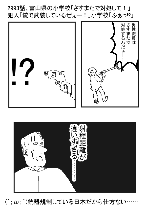 ★(ノ゜ω゜)(ノ゜ω゜)先生ぇー!どうすれば良かったんだぁー!? ーー †(m´・ω・`)……拳銃を相手が持ってるって知らなかったし…… そもそも相手が飛び道具もっている事を前提にすると、近接戦闘は不利すぎるしのう…… ー ★(ノ゜ω゜)(ノ゜ω゜)じゃ、どんな装備なら……? ーー †(m´・ω・`)日本は銃弾の入手が難しい国じゃし、大型の盾を用意して、無駄弾を消費させればワンチャンス……? ー ★(ノ゜ω゜)(ノ゜ω゜)でも、細長い、さすまたの方が場所とらないし、色んな状況に対処できるよね……?(普通の犯人なら薙刀とか包丁を持ってくるだろうし…… ーー †(m´・ω・`)男性職員達にどう命令すればええんじゃろうなぁ……この場合…… |