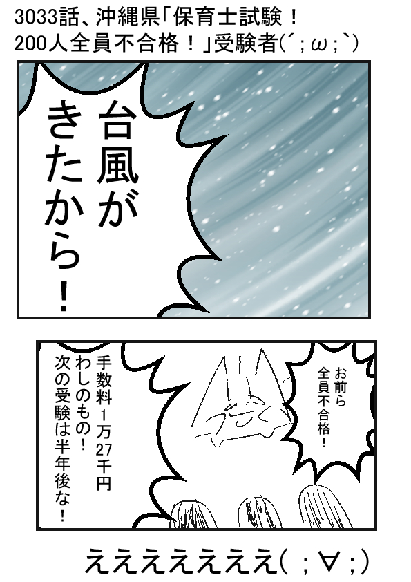 ー ★(ノ゜ω゜)(ノ゜ω゜)先生ぇー!どういうことだぁー!? 手数料の返金すらないぞー! ーー †(m´・ω・`)保育士は低待遇を強いられておるんじゃ! ー ★(ノ゜ω゜)(ノ゜ω゜)な、なんだってー!? ーー †(m´・ω・`)低待遇だから、人手不足じゃしな。 ー ★(ノ゜ω゜)(ノ゜ω゜)沖縄県、出生率高い県だろ!?保育士必要だよ!? ーー †(m´・ω・`)試験のために勉強した人らは涙目じゃな? ー ★(ノ゜ω゜)(ノ゜ω゜)!? ーー |