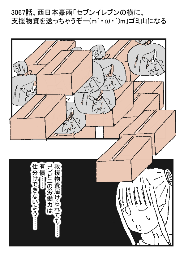 ー ★(ノ゜ω゜)(ノ゜ω゜)先生ぇー!支援物資を大量に送ったのに、なんで迷惑になるんだー!? ーー †(m´・ω・`)……ダンボールの中に、何が入っているのか確認しないといけないし。 さらに、それを配らないといけないから……めっちゃ労働力が必要になる。 コンビニの人がそれをやると、人件費になるしのう…… ー ★(ノ゜ω゜)(ノ゜ω゜)じゃ、この支援物資はどうなるの? ーー †(m´・ω・`)雨がふれば、商品価値もなくなってゴミになる。おしまい ー ★(ノ゜ω゜)(ノ゜ω゜)被災地に負担をかけるゴミ物資!? ーー |
