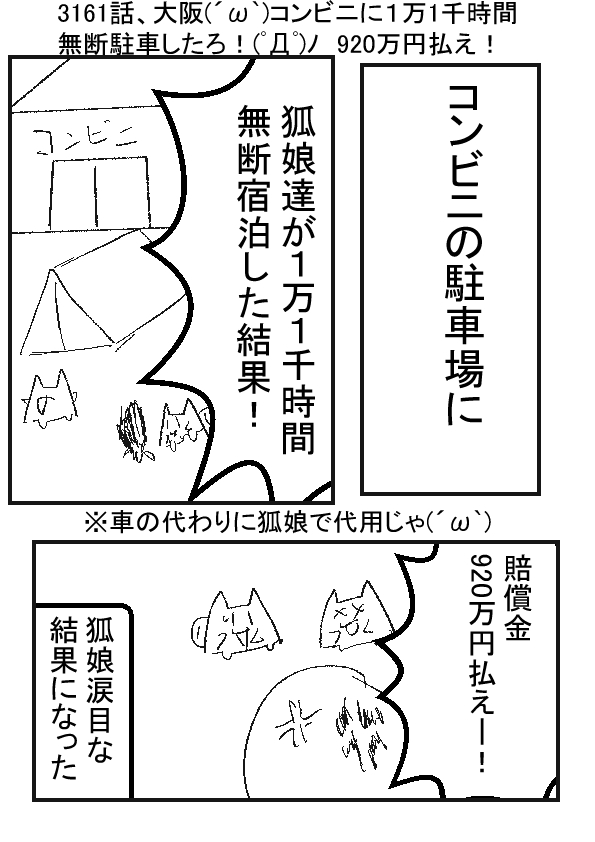 ーー ★(ノ゜ω゜)(ノ゜ω゜)先生ぇー!?コンビニに無断駐車しすぎだぞー!? ーー †(m´・ω・`)うむ……家の駐車場代わりじゃな…… ーー ★(ノ゜ω゜)(ノ゜ω゜)というか、普通に駐車場を借りた方が安いよね……? ーー †(m´・ω・`)(大阪は土地が高いから、駐車料もめっちゃ高くなるんじゃろうなぁ……) |