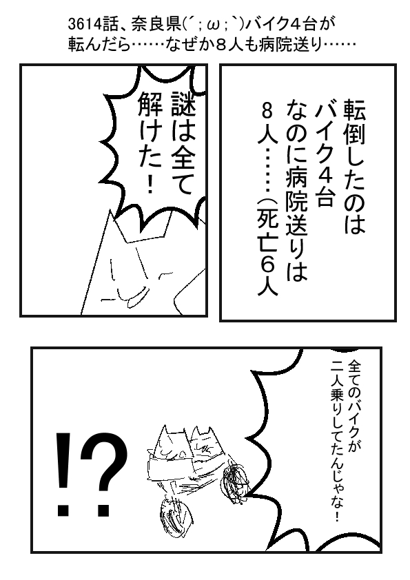 ーー ★(ノ゜ω゜)(ノ゜ω゜)先生ぇー!二人乗りは危ないって事でいいですかー! ーー †(m´・ω・`)……そんで、車間距離を取る事が重要じゃな……(4台転倒している時点で、短い車間距離じゃったろうし…… ーー ★(ノ゜ω゜)(ノ゜ω゜)他には? ーー †(m´・ω・`)バイクは事故った時が危ないから、車に乗った方がいいんじゃね? ーー ★(ノ゜ω゜)(ノ゜ω゜)バイクそのものを全否定した!? ーー |