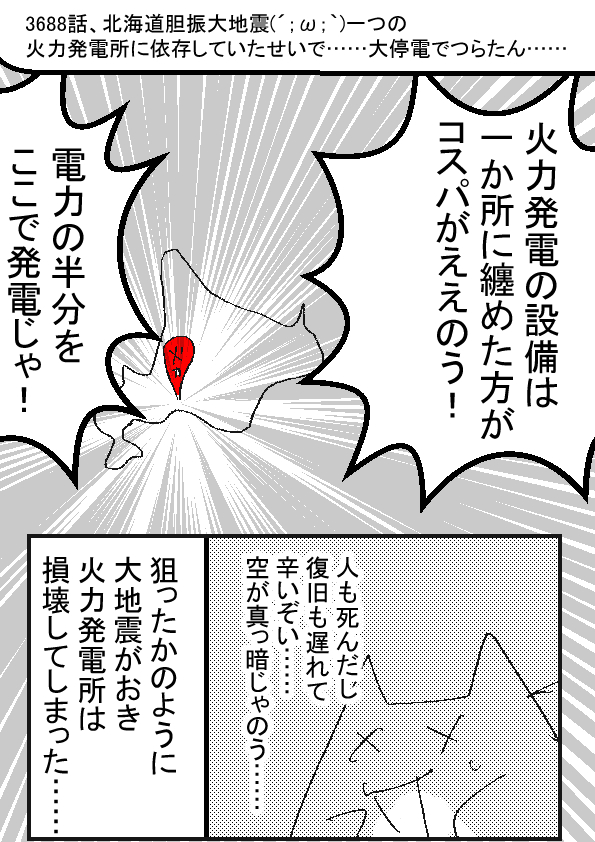 ー ★(ノ゜ω゜)(ノ゜ω゜)先生ぇー!つまり、どうすればいいんだぁー! ーー †(m´・ω・`)ほら、グローバル経済と一緒じゃよ。 コスト削減するために、海外から色んなものを輸入するのと同じで 一か所に纏めた方が安く済んだんじゃよ、たぶん ー ★(ノ゜ω゜)(ノ゜ω゜)じゃ、分散したり、設備を増やせばいいんじゃないの? ーー †(m´・ω・`)電気代が高くなるぞい? ー ★(ノ゜ω゜)(ノ゜ω゜)でも、一か所に依存すると、こういう災害が発生したら、停電するでしょ? ーー †(m´・ω・`)誰がその金をだすの? ー ★(ノ゜ω゜)(ノ゜ω゜)北海道の皆 ーー †(m´・ω・`)(一つの場所に依存するのは駄目じゃから、やはり分散した方がええ……?) |