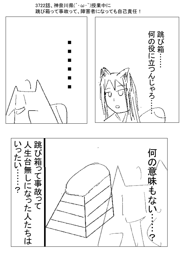 ーー ★(ノ゜ω゜)(ノ゜ω゜)先生ぇー!そもそも跳び箱って何の役に立つんですかぁー!? ーー †(m´・ω・`)飛ぶ練習? ーー ★(ノ゜ω゜)(ノ゜ω゜)それなら、走り幅跳びでいいだろ!? ーー †(m´・ω・`)何の役に立つのかしらんがな ーー ★(ノ゜ω゜)(ノ゜ω゜)じゃ……跳び箱で事故って、人生台無しにした意味は……? ーー †(m´・ω・`)何の意味もない ーー ★(ノ゜ω゜)(ノ゜ω゜)ひでぇ…… ーー |