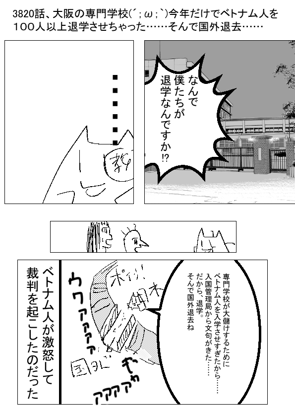 ーー ★(ノ゜ω゜)(ノ゜ω゜)先生ぇー!ベトナム人が大勢犠牲になりましたぁぁぁぁ! ーー †(m´・ω・`)つまり、どういうことじゃ? ーー ★(ノ゜ω゜)(ノ゜ω゜)大勢のベトナム人の学歴がひどいことに! ーー †(m´・ω・`)ふむふむ、それで? ーー ★(ノ゜ω゜)(ノ゜ω゜)学費の払い損! ーー †(m´・ω・`)(貧しい国じゃから、下手したら借金して日本にきている可能性があるのう……) |