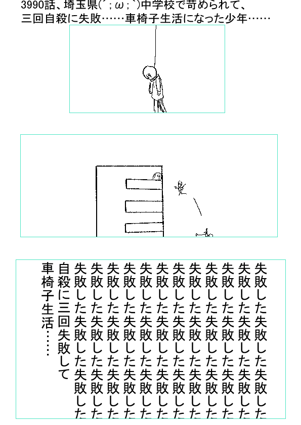 ーー ★(ノ゜ω゜)(ノ゜ω゜)先生ぇー!どんなイジメをしたんだぁー! ーー †(m´・ω・`)さぁ……? でも、三回も自殺して失敗って、すごいよね…… ーー ★(ノ゜ω゜)(ノ゜ω゜)これからの人生台無しだよ!? ーー †(m´・ω・`)足が動かんと……なんもできないしのう…… ーー ★(ノ゜ω゜)(ノ゜ω゜)これから、この14歳の人生はどうなると思う? ーー †(m´・ω・`)学校から賠償金とって、それで余生を過ごすとか……?(加害者側は払わずに逃げるだろうし) ーー ★(ノ゜ω゜)(ノ゜ω゜)14歳で余生!? |