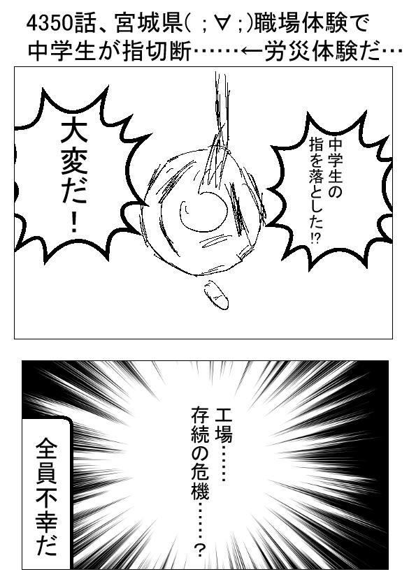 ★(ノ゜ω゜)(ノ゜ω゜)先生ぇー!職場体験が労災体験になったぞー! ーー †(m´・ω・`)うむ……大変じゃな…… ーー ★(ノ゜ω゜)(ノ゜ω゜)これ、工場倒産……? ーー †(m´・ω・`)周りの評判が落ちまくって、工場存続の危機じゃな…… |