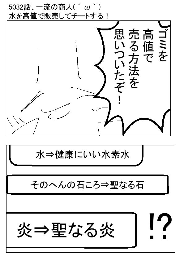 ー ★(ノ゜ω゜)(ノ゜ω゜)先生ぇー!水で高値で売れるって、どういう事だぁー!? ーー ●( ´ ω ` )一流の商人は、ゴミを高値で売れるんじゃよ! ー ★(ノ゜ω゜)(ノ゜ω゜)い、一流の商人!? ーー ●( ´ ω ` )うむ、需要ほぼゼロの商品を販売させて、営業の人を試す試練が、近江商人にあ―― ー ★(ノ゜ω゜)(ノ゜ω゜)こらー!?故郷の事を悪くいうなぁー!? ーー ●( ´ ω ` )(一流じゃのう……) |