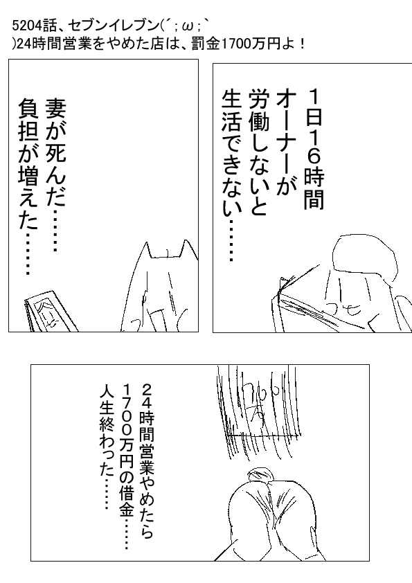 >時短となった今も朝5時〜夕方6時まで13時間ほど働く。24時間営業なら16時間は働かないと店が回らないという。妻の死後8カ月ほどで完全に休んだ日は片手で足りる。 ー ★(ノ゜ω゜)(ノ゜ω゜)先生ぇー!コンビニがブラック企業すぎるぞー! ーー ●( ´ ω ` )ライバルを仲間にして使い潰すシステムじゃし…… ー ★(ノ゜ω゜)(ノ゜ω゜)えと、ライバルに金を出させて店を作らせて、本部が儲けるシステムだったけ…… ーー ●( ´ ω ` )…… (ˇωˇ)現実はクソゲ……スヤァ… ー ★(ノ゜ω゜)(ノ゜ω゜)過労死か借金か……どうなる……? ーー ●( ´ ω ` )(コンビニのオーナーになったせいで、財産消えるわ、借金残るわ、過労労働させられるわ……地獄じゃな……) |