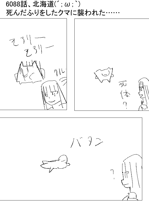 ー ★(ノ゜ω゜)(ノ゜ω゜)先生ぇー!このクマ頭いいぞ! ーー ●( ´ ω ` )これはクマった? ー ★(ノ゜ω゜)(ノ゜ω゜) ーー ●( ´ ω ` )くまは、野戦のプロじゃから、銃もった人間相手でも、それなりに戦えて強いって事なのかのう…… (道具扱う能力に全ふりしている人間の方がやばいけど ー ★(ノ゜ω゜)(ノ゜ω゜)よし、先生! クマがこの時期、えさに困っているから……食われにいけ! ーー ●( ´ ω ` )(人を殺したクマが発生したら、余計に被害増えないか……?) |