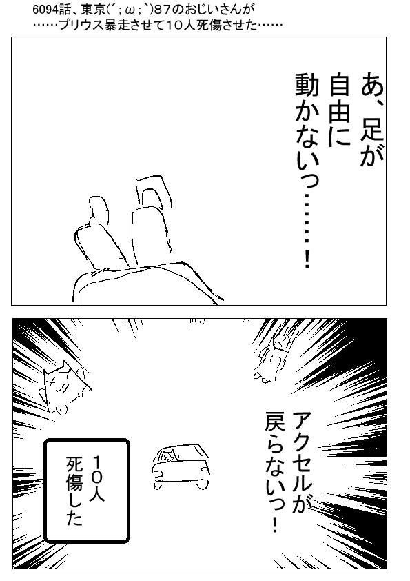 ー ★(ノ゜ω゜)(ノ゜ω゜)先生ぇー!大変だぁー! ーー ●( ´ ω ` )87歳なら……刑務所にいっても、何のデメリットもないのう…… ー ★(ノ゜ω゜)(ノ゜ω゜)足が自由に動かなくなってる時点で…… そもそも、ひとり暮らしできない体になりつつある訳だし…… ーー ●( ´ ω ` )(必然的な事故じゃな……これ……) |