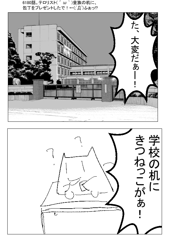 ー ★(ノ゜ω゜)(ノ゜ω゜)先生ぇー!大変だぁー! ーー ●( ´ ω ` )皇族の通う学校って、普通の学校と同じくらいの警備なんじゃろうか…… ー ★(ノ゜ω゜)(ノ゜ω゜)……というか、犯人逮捕されるでしょ…… 学校の内部情報に詳しい人がかかわっている時点で、その線から、犯人捕まりますって…… ーー ●( ´ ω ` )(犯人像が全く予想できない……皇室脅して得るものって、なんじゃろう……歴史的な破滅フラグだってわかるじゃろうに……) |